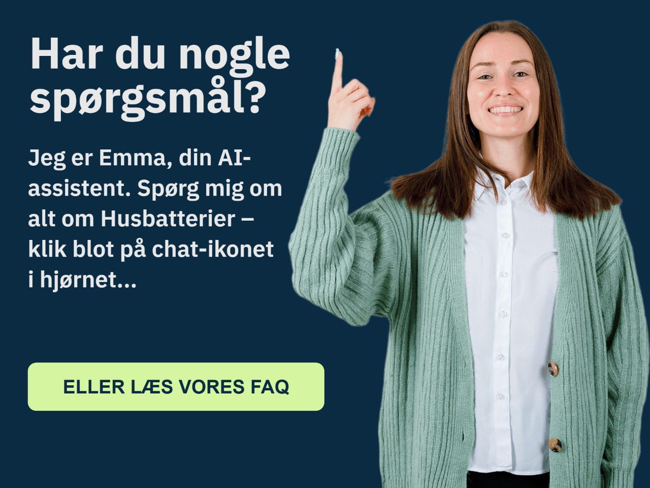 *) Tallene afspejler de aktuelle forventninger til markedsudviklingen og aFRR i 2026. BEMÆRK: DET VISTE EKSEMPEL TAGER UDGANGSPUNKT I ET 20 KWH HUSBATTERI I DK2 (SJÆLLAND & BORNHOLM). Vær opmærksom på, at i DK1 (Jylland & Fyn) forventes niveauet at være ca. 20 % lavere, ligesom der er en forskel på ca. 65 % i indtjeningspotentialet mellem 10 kWh og 20 kWh, da det store batteri har større udholdenhed og dermed kan levere systemydelser i længere tid. Vil du se de præcise tal for din situation, kan du spørge vores AI-assistent, Emma, her på siden for at få en beregning tilpasset din landsdel og batteristørrelse.