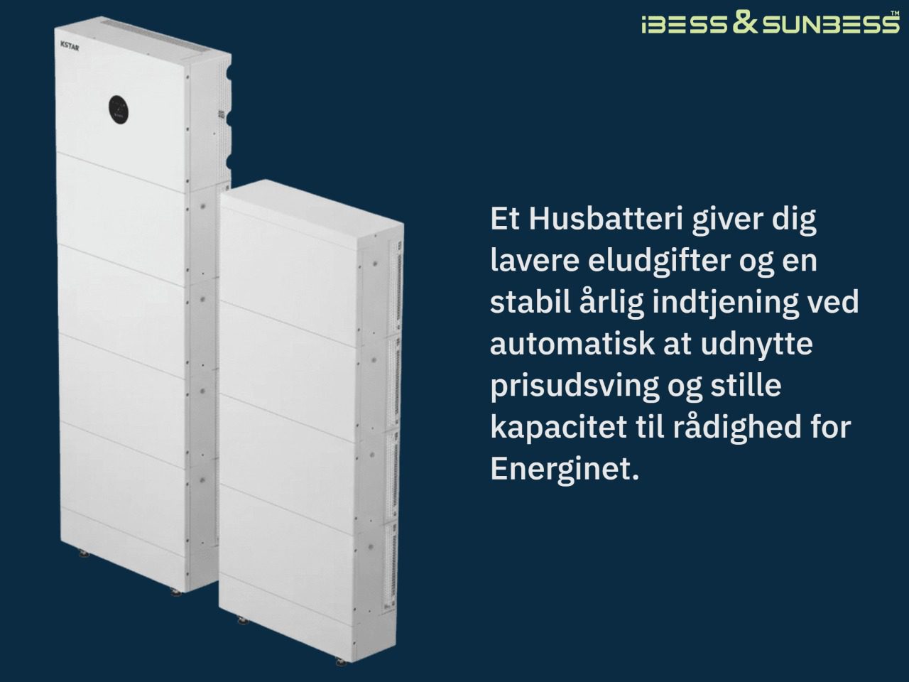 Tag kontrollen over din strøm og økonomi med IBESS Husbatteri uden solceller eller SUNBESS Husbatteri til solceller. Med disse løsninger kan du spare penge, optimere dit energiforbrug og samtidig tjene penge på at balancere elnettet – alt sammen helt automatisk.
